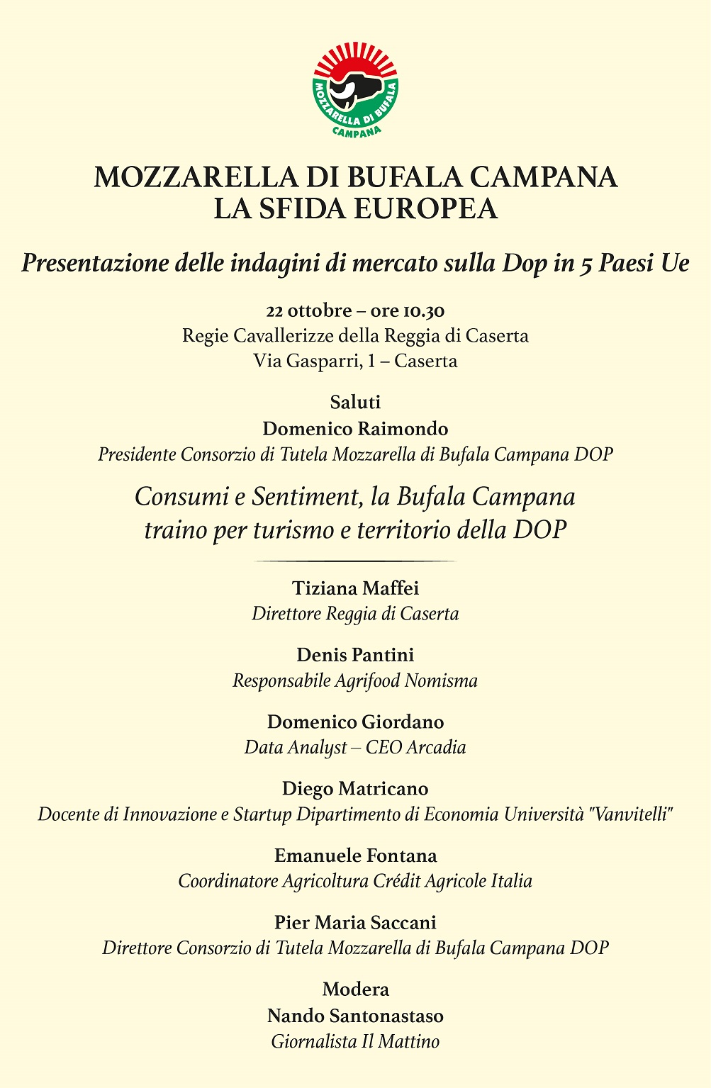 Dopo i saluti del presidente del Consorzio, Domenico Raimondo, all’iniziativa interverranno: Tiziana Maffei, direttore della Reggia di Caserta; Denis Pantini, responsabile Agrifood Nomisma; Domenico Giordano, data analyst e ceo di Arcadia; Diego Matricano, docente di Innovazione e Startup al Dipartimento di Economia dell’Università “Vanvitelli”; Emanuele Fontana, coordinatore Agricoltura di Crédit Agricole Italia e Pier Maria Saccani, direttore del Consorzio di Tutela Mozzarella di Bufala DOP. Modera il giornalista Nando Santonastaso.