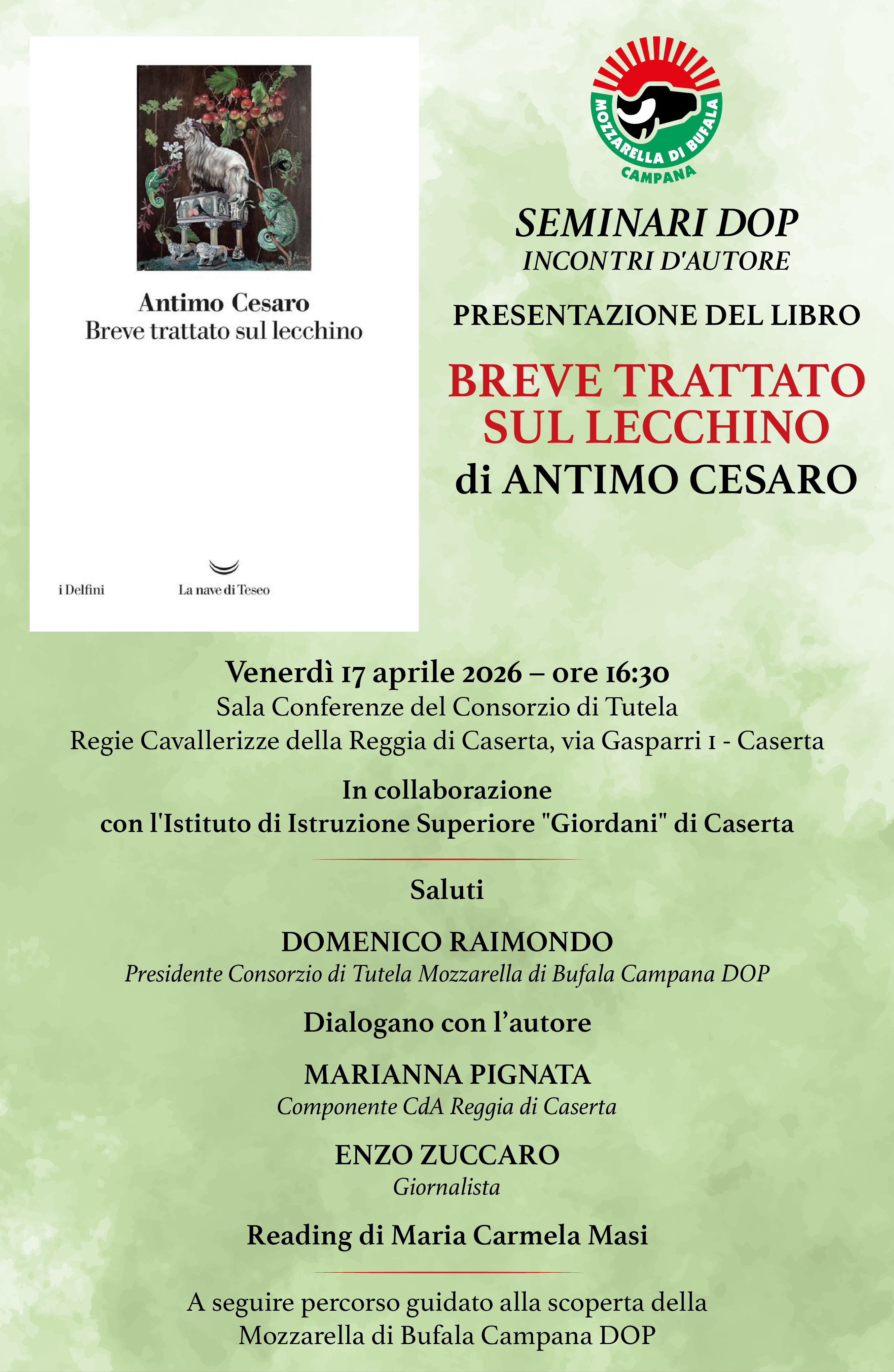 Attraverso la storia e la letteratura – da Aristotele a Dante, da Machiavelli a Musil – Cesaro descrive il ritratto impietoso di una creatura immortale, il lecchino. Con l’autore dialogheranno Marianna Pignata, componente del cda della Reggia di Caserta, e il giornalista Enzo Zuccaro. Reading a cura di Maria Carmela Masi. Previsti gli interventi degli studenti dell'Iss "Giordani" di Caserta, partner del progetto.